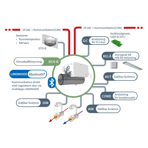 - Justerer flow og aktiverer ekstra opvarmning eller køling i henhold til indstillede sætpunkter, driftstilstand og målte klimadata.