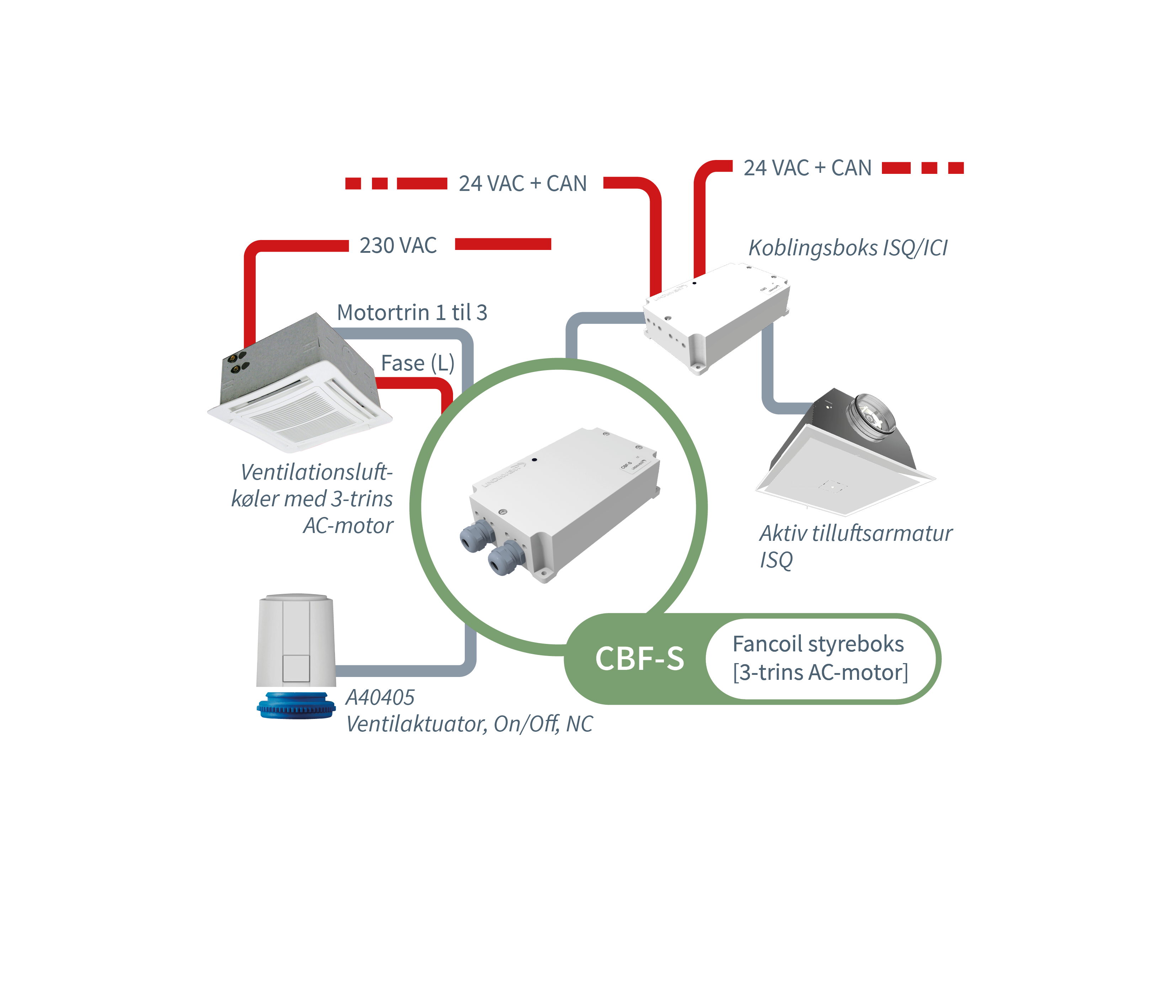Ønskes ekstra køling, udover fra Lindinvents tilluftsarmaturer, kan CBF-S anvendes til at styre ventilatorluftkølere i rækkefølge med armaturet. Energiforbruget optimeres ved at styre yderligere varme og køling i samme system.