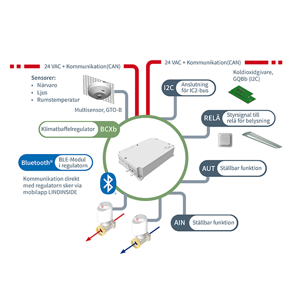 BCXb er beregnet til regulering af rumklimaet via kølebaffel. Styringen bruges fortrinsvis til at styre en VAV-baffel, som har en indbygget motor til justering af dyser. Regulatoren har funktionalitet til at styre opvarmning, køling og luftstrøm i rækkefølge ved hjælp af temperatur-, kuldioxid- og tilstedeværelsessensorer. Alle sensorer kan formonteres i baffelen, hvilket giver en hurtig og nem installation på arbejdspladsen.