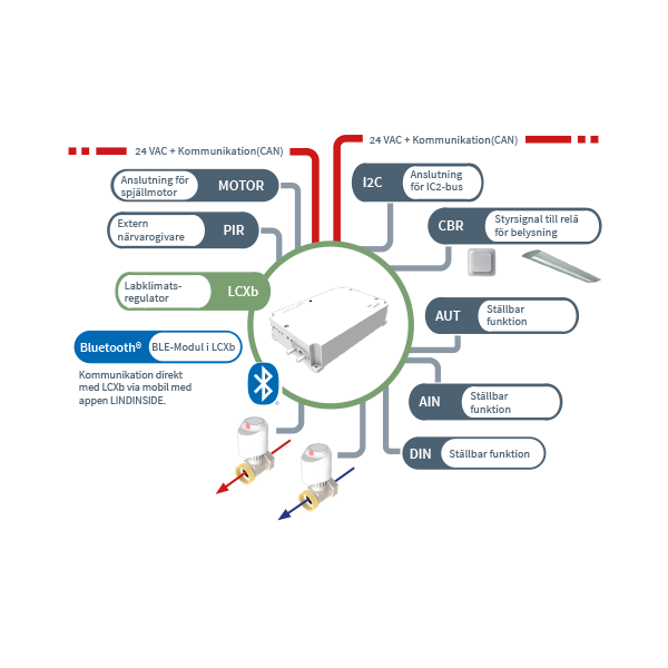 LCXb er beregnet til behovsstyring af rumklima i laboratorier. Rumklimaet styres ud fra aktiv fraluftsregulering, som afbalanceres af undertempereret indblæsning. Regulatoren er inkluderet i rumklimastyring DCV-LCb. Controlleren understøtter en række funktioner: