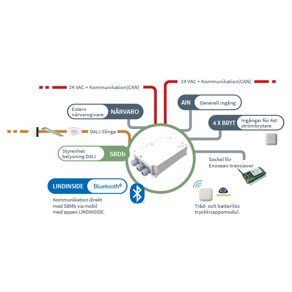 Nærværsstyret og dagslyskompenseret belysning sparer energi. Med SBDb kan du styre DALI-armaturer samt bruge kontakter og sensorer som slaver. Alt er visualiseret i LINDINSPECT® webgrænsefladen. Ved at bruge ESW kan du desuden styre din belysning trådløst og uden batterier takket være EnOcean®-teknologi.