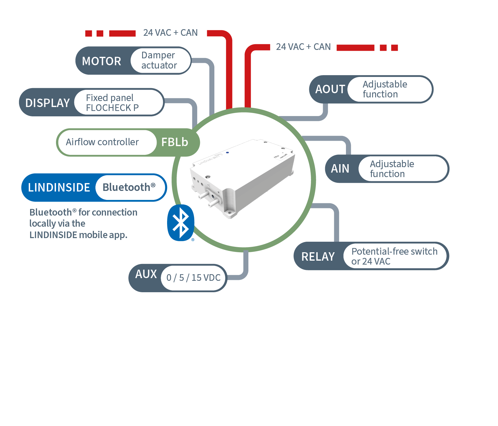 FBLb is used with a damper, a damper actuator and a measuring flange for balancing supply and extract air or for maintaining a constant airflow. The controller is also used for flow measurement. The integrated air flow sensor is factory calibrated. FBLb is included in airflow control unit DCV-BLb and in flow measurement unit DCV-MFb, see the product category Smart Dampers. The controller is connected to 24 VAC and a communication loop (CAN)