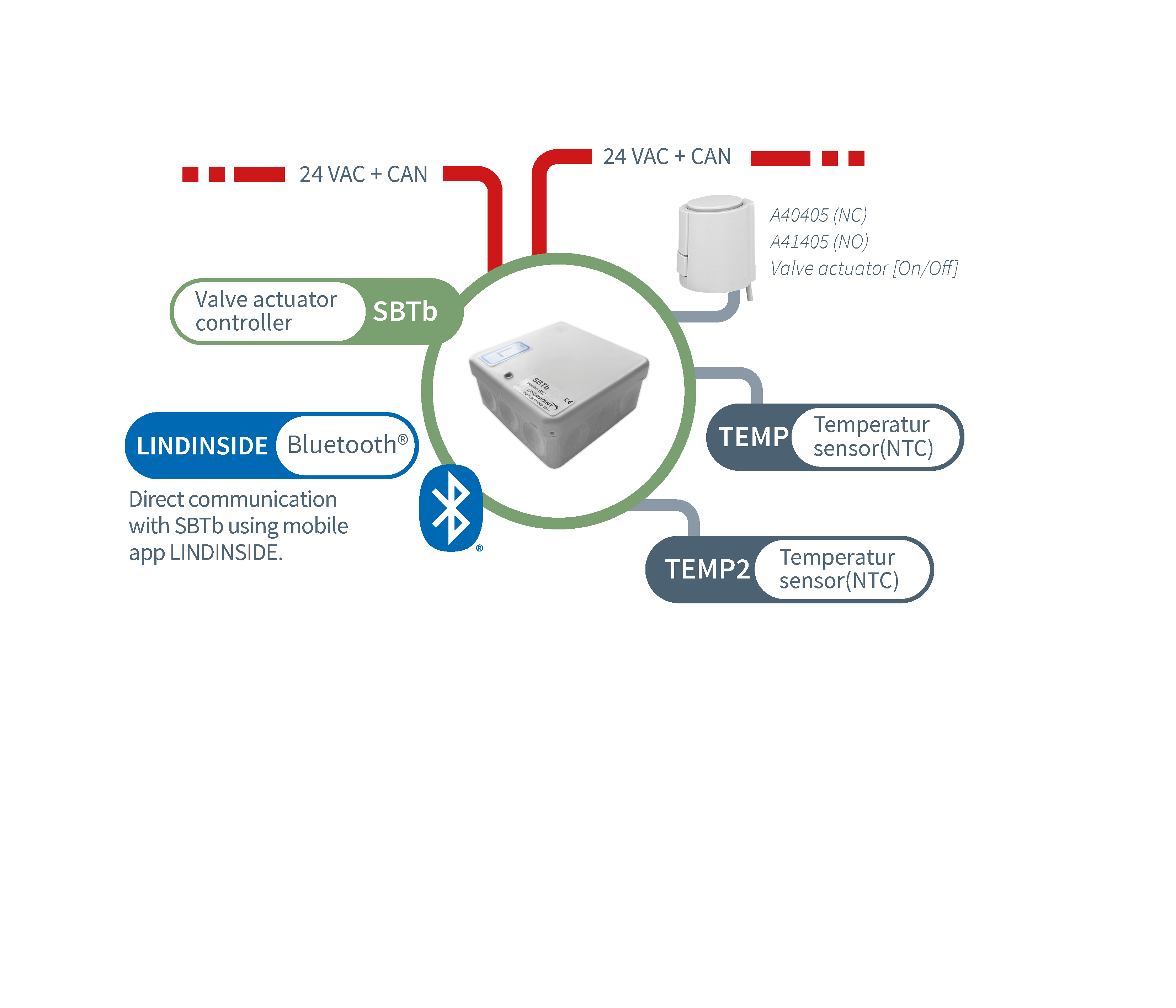 With SBTb, radiator actuators can be controlled in groups from room climate controllers via connection directly to the installed communication loop (CAN). Troublesome cable routing directly from a room climate controller can be avoided.