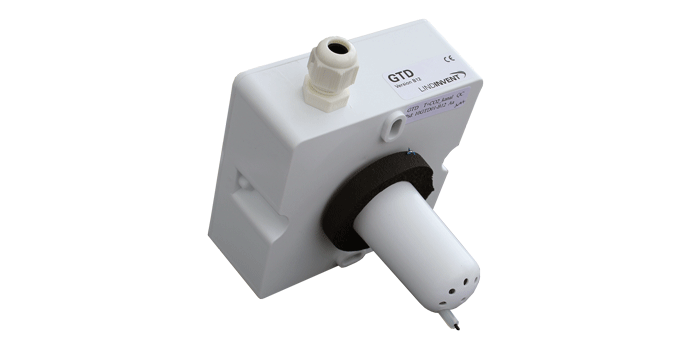 GT-D is a temperature sensor designed to be fitted in a duct and is mounted inside a box with an insertion tube.