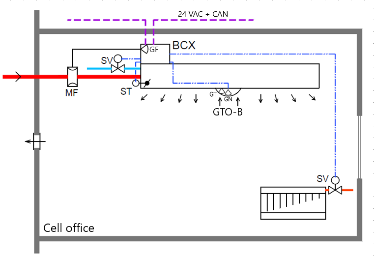 GTO-B is a unit intended for mounting in the grid of a chilled beam working with Lindinvent's chilled beam controller BCXb. The delivery unit consists of the combined sensor and detector enclosure and a cable.