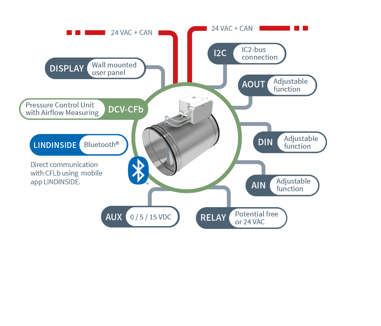 DCV-CFb is consisting of pressure controller with airflow measuring CFLb, a damper actuator and a damper with measuring flange. Units with a circular damper (Ø100-500) are delivered factory assembled. For other damper sizes, the damper, measuring flange, damper actuator and controller are delivered separately.