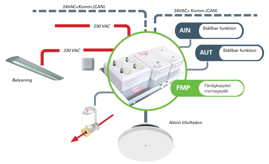 Färdigkopplad montageplåt med det aktiva donets kopplingsbox förmonterad med Wago-kablage för snabbare inkoppling till utrustningar. Montageplåten kan beställas i varianter där exempelvis tillbehör för belysningsstyrning är förmonterade till kopplingsboxen. De inkopplade tillbehören kan också vara kompletterade med Wago-kablage.