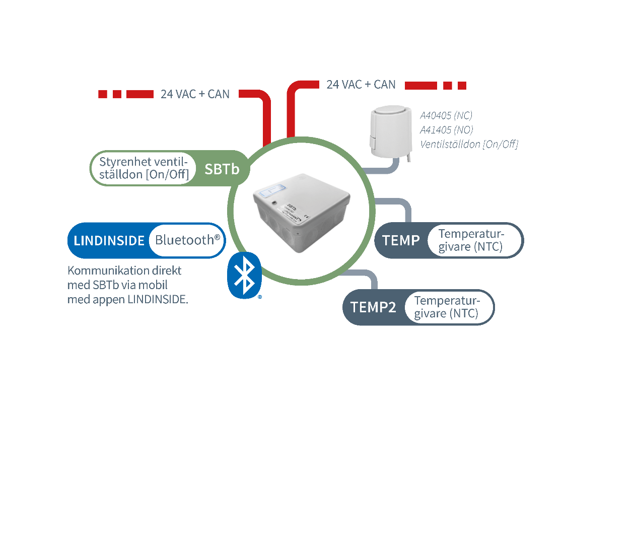 SBTb är en styrenhet för en grupp av termoställdon via inkoppling direkt på installerad kommunikationsslinga (CAN). Med SBTb kan radiatorställdon styras i grupper från olika tilluftsregleringar via nätverk. Kabelanslutning till ställdonen kan förläggas längs fasaden så att eventuell besvärande kabeldragning från respektive klimatreglering kan undvikas.