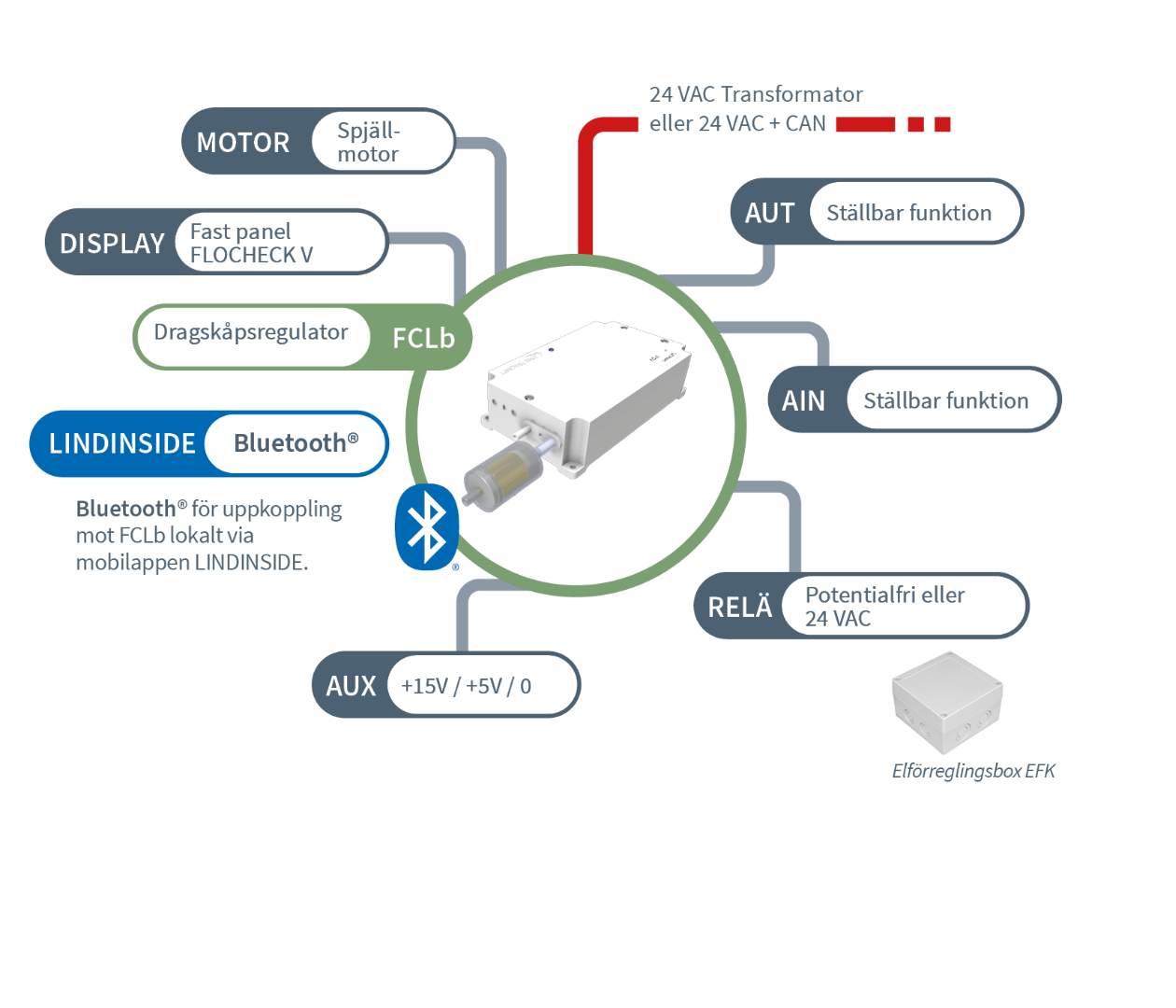 - Elförreglingskontaktorn EFK kan anslutas. Via EFK kan FCLb bryta spänningen till eluttag vid larm för att exempelvis undvika risk för explosioner vid hantering av brandfarliga substanser.