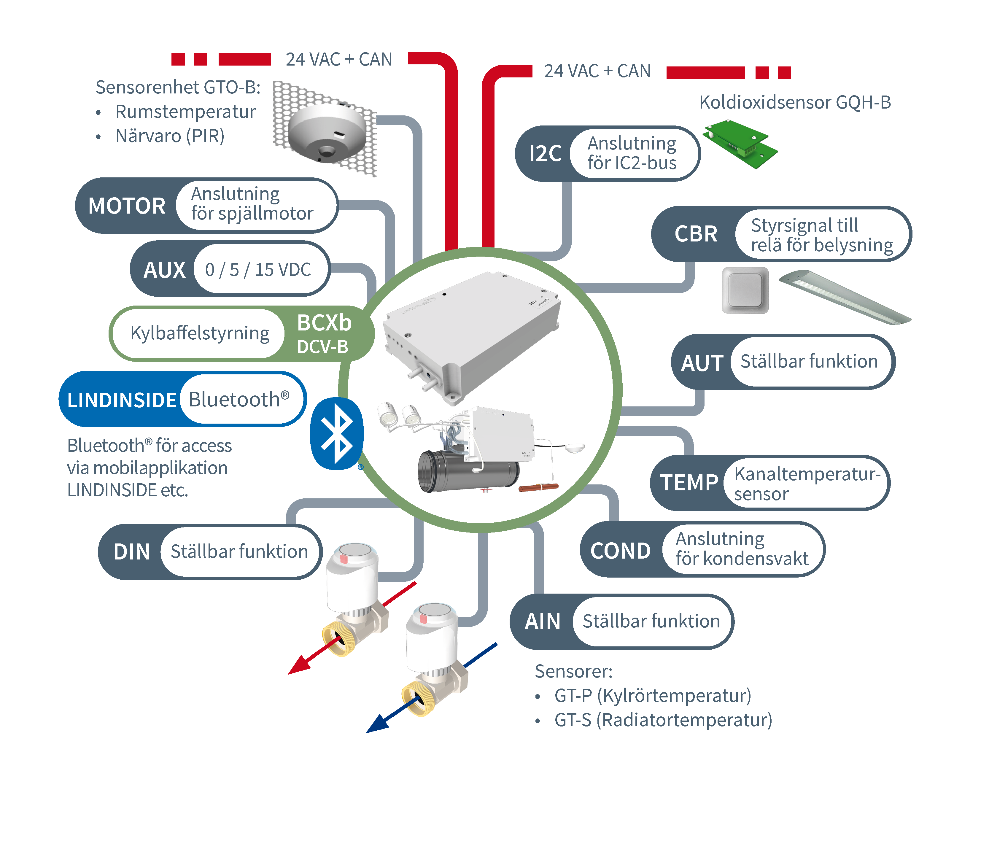 - Ansluts till CAN-slinga för samverkan och kommunikation.