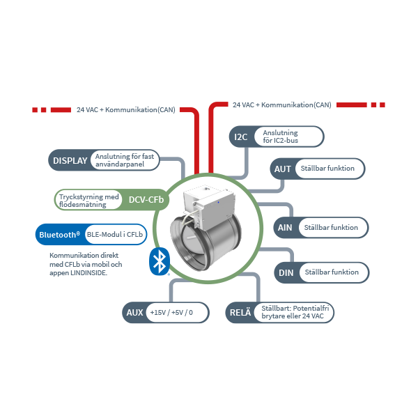 DCV-CFb är en styrenhet som består av Tryckregulator med flödesmätning CFLb, en spjällmotor och ett spjäll med mätfläns. Enheter med ett cirkulärt spjäll (Ø125-500) levereras fabriksmonterade. För övriga spjällstorlekar levereras spjäll, mätfläns, spjällmotor och regulator separat.
