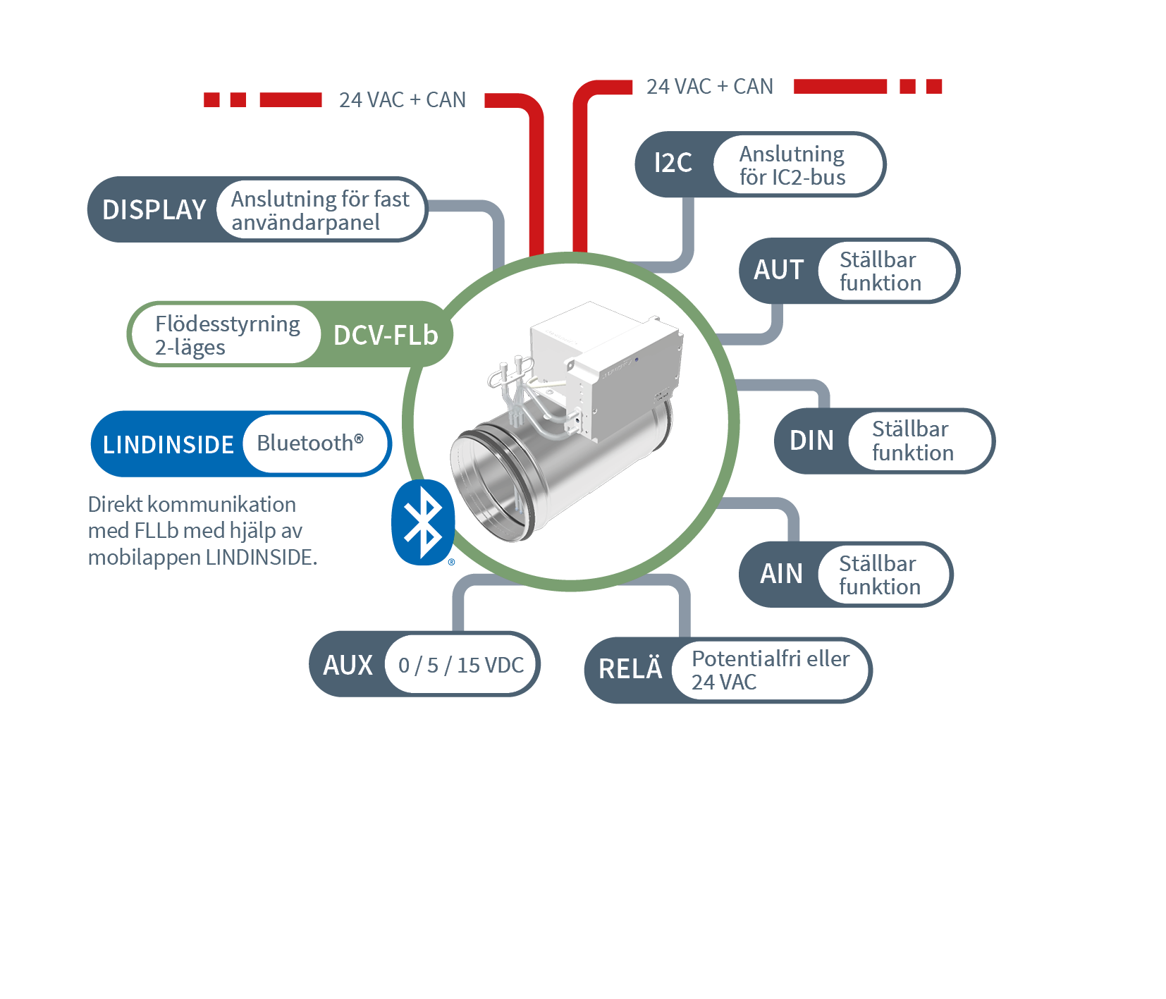- Ansluts via Nod-ID till en trådbunden slinga (ett lokalt nätverk (CAN) av samverkande styrenheter).