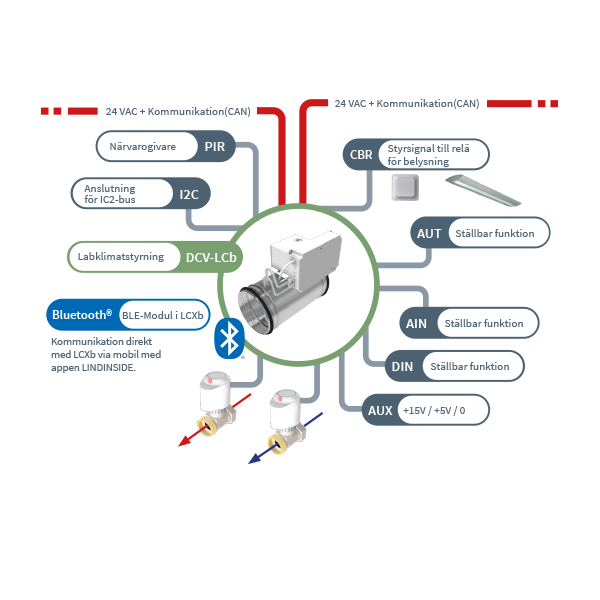 DCV-LCb är en styrenhet för rumsklimatstyrning i ett laboratorium. Enheten består av labbklimatsregulator LCXb, en spjällmotor och ett spjäll med mätfläns. Enheter med ett cirkulärt spjäll (Ø120-500) levereras fabriksmonterade. För övriga spjällstorlekar levereras spjäll, mätfläns, spjällmotor och regulator separat.