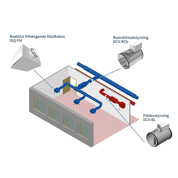 - ISQ-FM är avsedda för större ytor utan större behov för flexibilitetskrav. Styrning och givare får med DCV-RCb och DCV-BLb som är spjällbaserade lösningar.