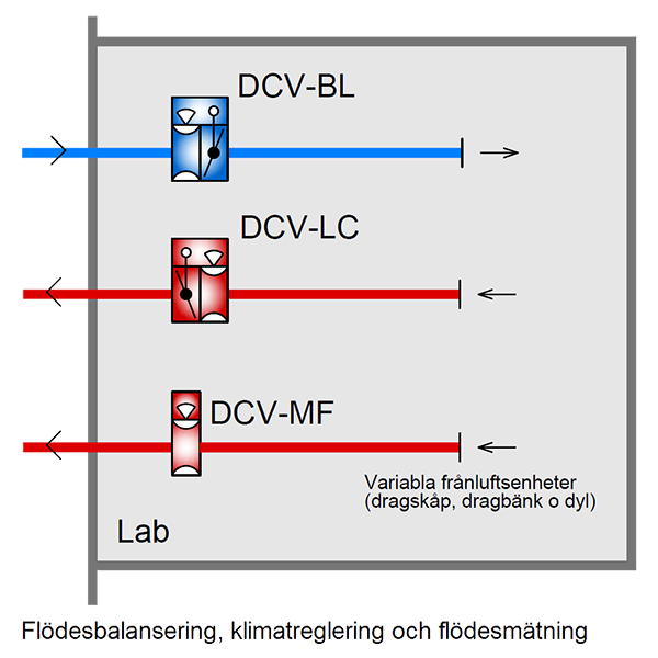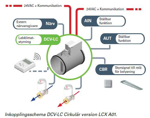 DCV-LC är en styrenhet som består av labbklimatregulator LCX, en spjällmotor och ett spjäll med mätfläns. Enheter med ett cirkulärt spjäll (Ø125-500) levereras fabriksmonterade. För övriga spjällstorlekar levereras spjäll, mätfläns, spjällmotor och regulator separat.