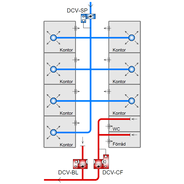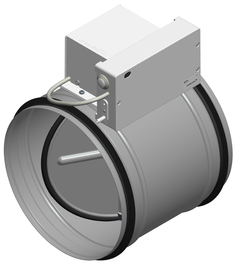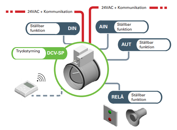 DCV-SP är en styrenhet som består av tryckregulator SPL, en spjällmotor och ett spjäll. Enheter med ett cirkulärt spjäll (Ø125-500) levereras fabriksmonterade. För övriga spjällstorlekar levereras spjäll, spjällmotor och regulator separat.