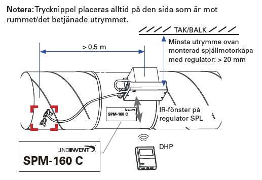 - Kan reglera till lägsta tryck i kanal som ger tillräckligt flöde i sämst belägna don genom att avläsa donets öppningsgrad. Detta sänker ljudnivån till ett minimum. Sämst belägna don kan förflyttas till en annan del av systemet beroende på belastning.