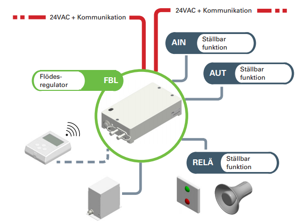 FBL är fabrikskalibrerad och den kan levereras monterad som regulator i flödesstyrning DCV-BL eller flödesmätning DCV-MF. Regulatorn ansluts både till 24 VAC och en kommunikationsslinga(CAN) via en gemensam 4-ledare.