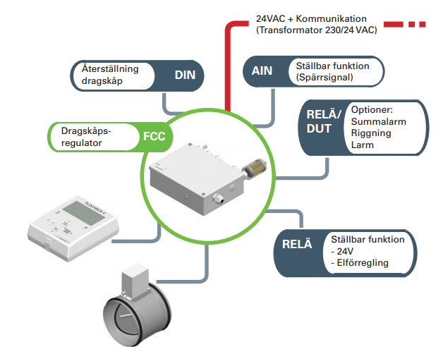 FCC reglerar snabbt och noga (via en spjällmotor) lufthastigheten i dragskåpsluckans öppning till 0,5 m/s oavsett luckans öppningshöjd (under säkerhetshöjd).