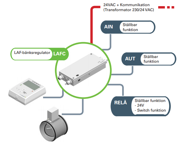 LAFC används inom behovsstyrd ventilation tillsammans med användargränssnittet SDU som har klartextmeddelanden och lysdioder för status. Dessutom kan följande anslutas till LAFC: