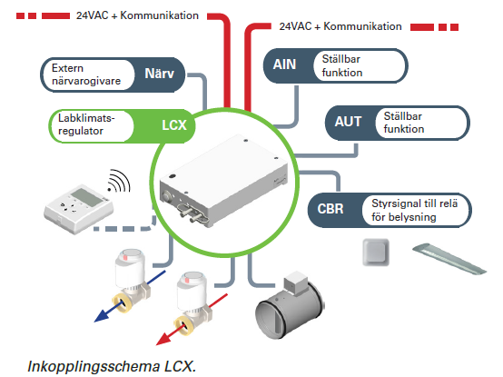 LCX är avsedd för behovsstyrning av rumsklimat i laboratorier. Rumsklimatet styrs med utgångspunkt från en aktiv frånluftsreglering som balanseras upp av undertempererad tilluft. Regulatorn ingår i rumsklimatstyrning DCV-LC. Regulatorn stödjer ett antal funktioner: