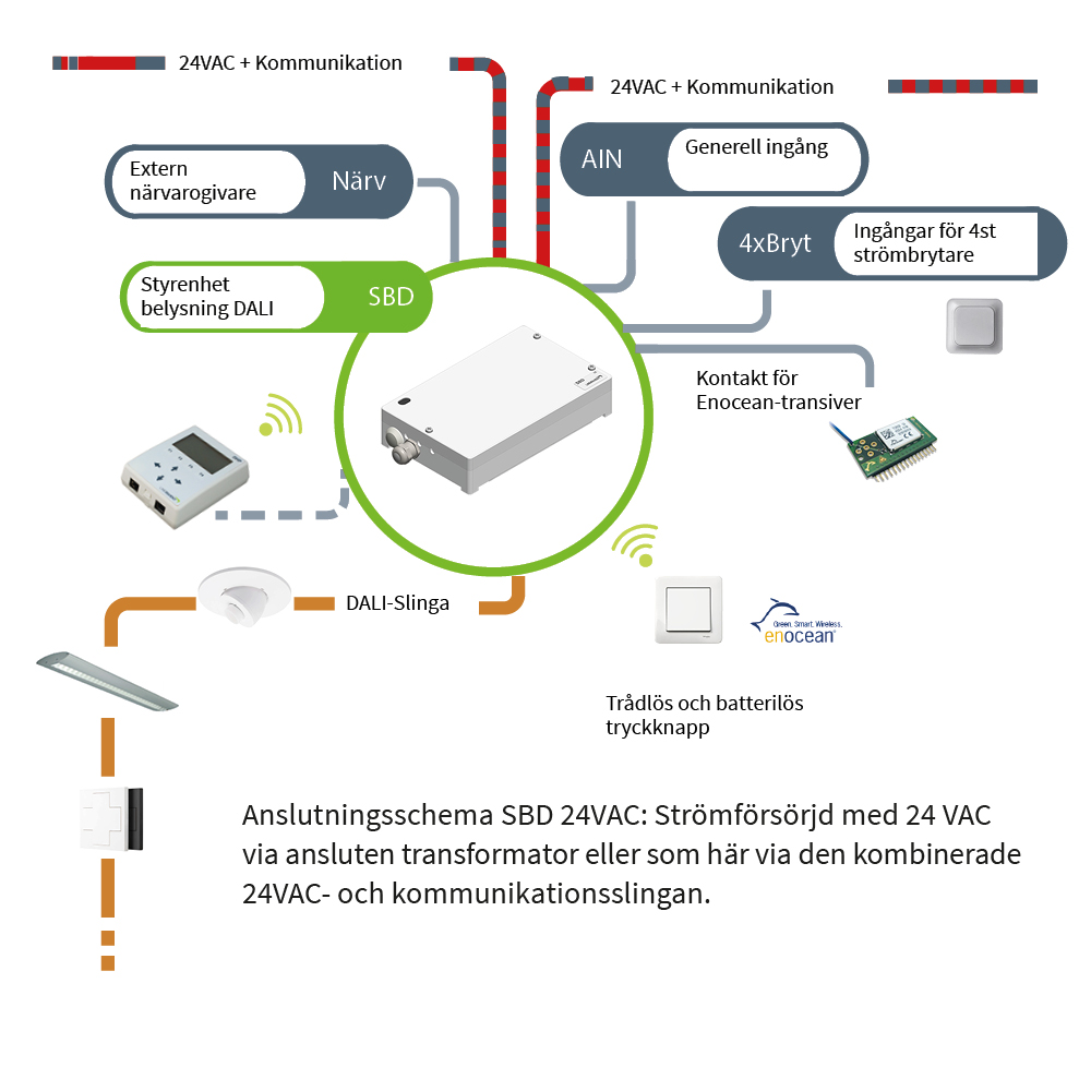 SBD kan utrustas med en Enocean-receiver för anslutning av upp till 16 stycken tråd- och batterilösa strömbrytare. Enocean-teknologin gör det möjligt att kommunicera via tryckknapparna inom en radie av 15 meter från SBD.