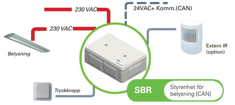 Via SBR kan kompletterande belysningar flexibelt knytas till belysningszoner direkt via anslutning till Lindinvents kommunikationsslinga (CAN).